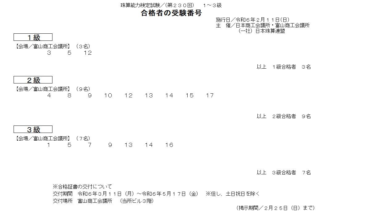 珠算検定1~3級(2/11施行分)合格者番号