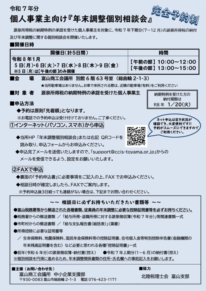2025.12.03 令和7年(2025年)分 個人事業主向け「年末調整個別相談会」《完全予約制》 相談会お知らせ マネーフォワードクラウド会計ソフトをご利用の皆様へご案内 PDF [1.14 MB] こちらからお申し込みください! お申し込みフォーム