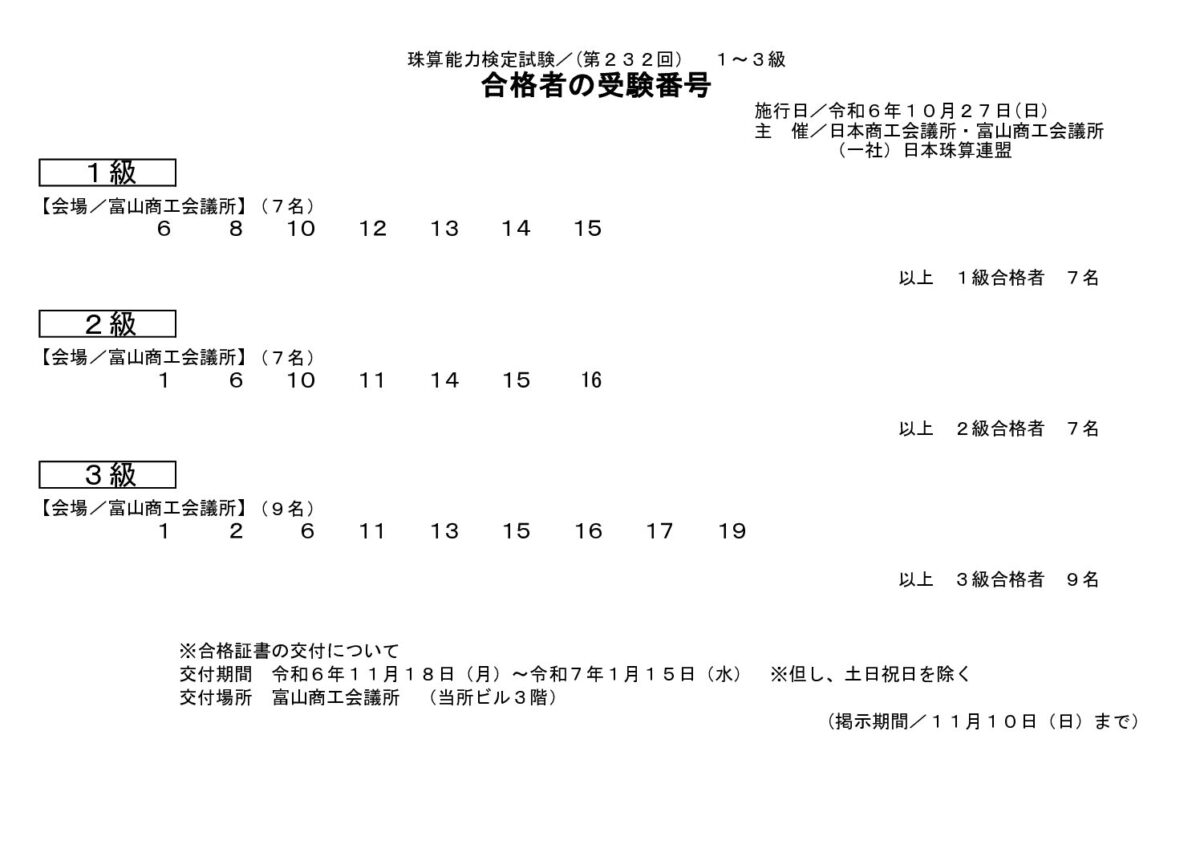 珠算検定1~3級(10/27施行分)合格者番号