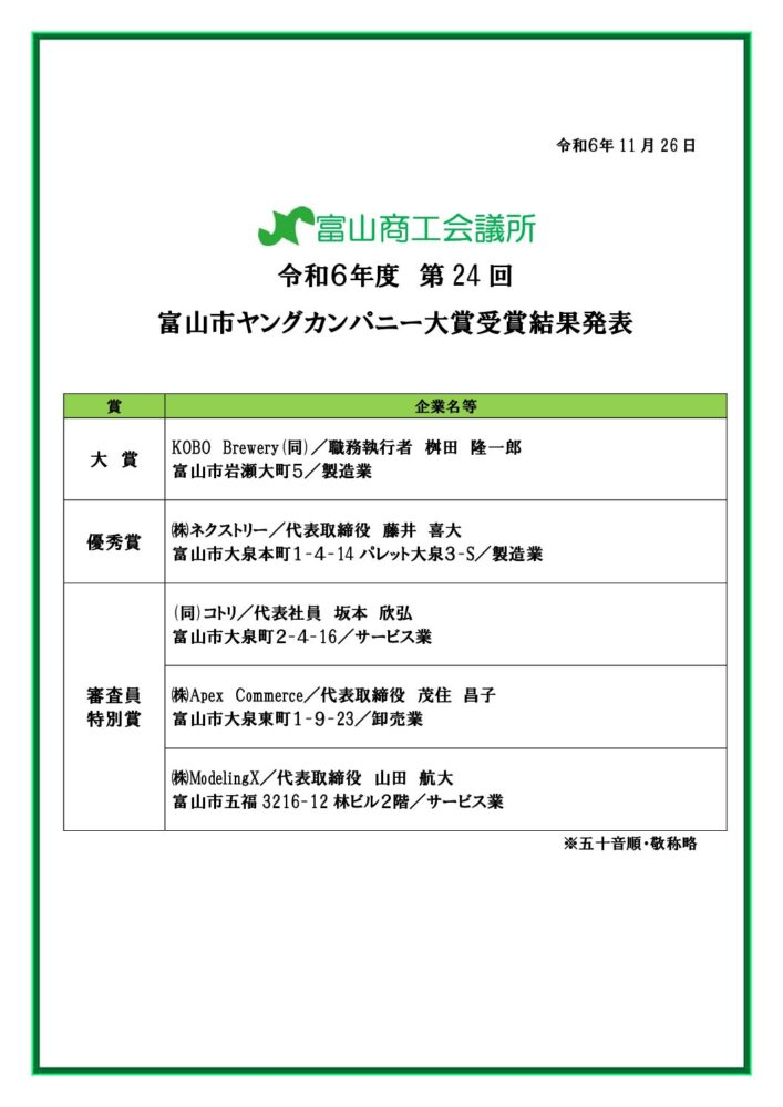 2024.11.26 令和6年度富山市ヤングカンパニー大賞 受賞結果 ≪速報≫ お知らせ 8月から募集を開始しておりました『富山市ヤングカンパニー大賞』。今年は19件の応募があり、審査委員会・運営委員会を経て、本日(11/26)に受賞企業が決まりました。 受賞された企業の皆さま、おめでとうございます!! PDF [30.28 KB]