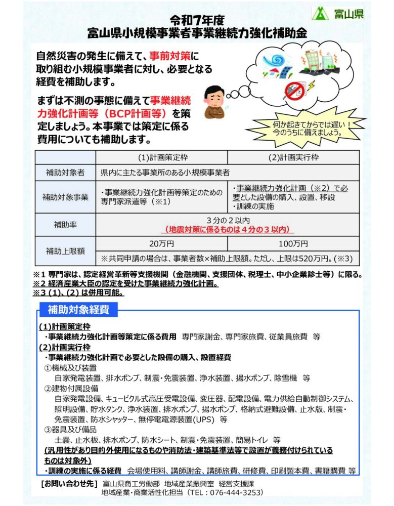 令和7年度 富山県小規模事業者 事業継続力強化補助金 5/20(火)公募受付開始