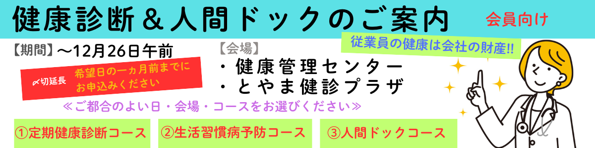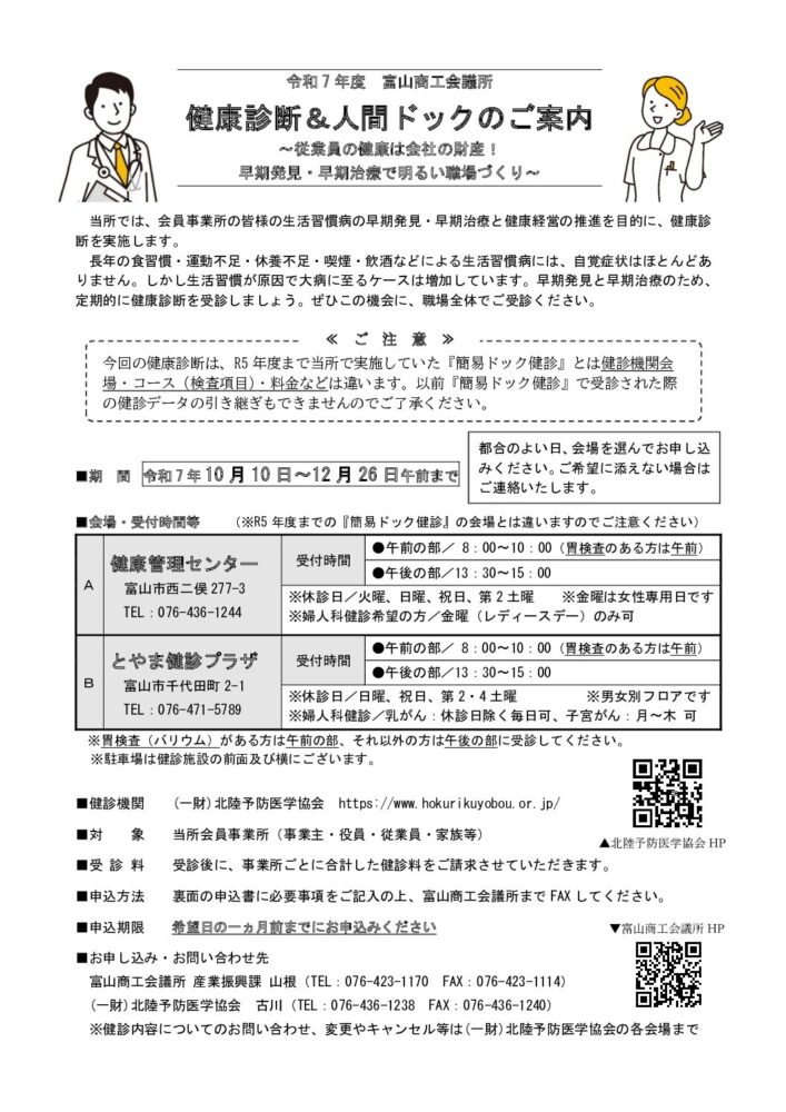 2025.07.18 会員向け 健康診断&人間ドックのご案内 イベントお知らせ ▼詳しくはこちらをクリックしてください 下記の申込書(PDF)をダウンロードして内容をご記入の上、FAX(076-423-1114)もしくはメール(infotym@ccis-toyama.or.jp)にてご送信ください PDF [426.55 KB]