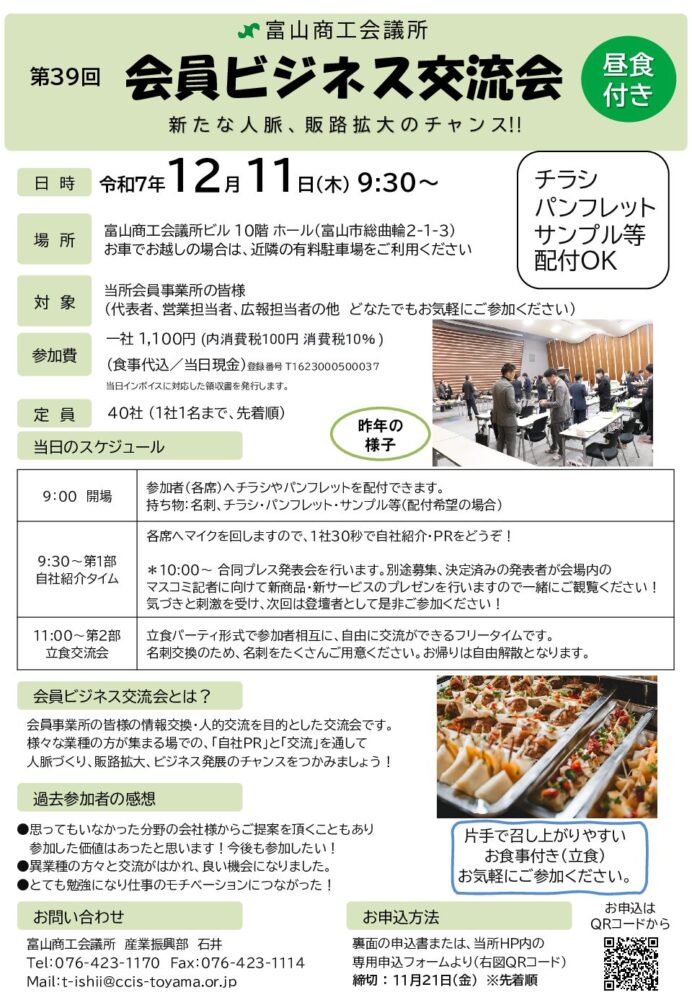 2025.10.21 第39回 会員ビジネス交流会 イベント 定員に達しましたので、現在はキャンセル待ちでの受付となります。 空きが出た際には、先着順でこちらからご連絡いたします。 会員ビジネス交流会参加企業 業種 PDF [788.61 KB] こちらからお申し込みください! お申し込みフォーム
