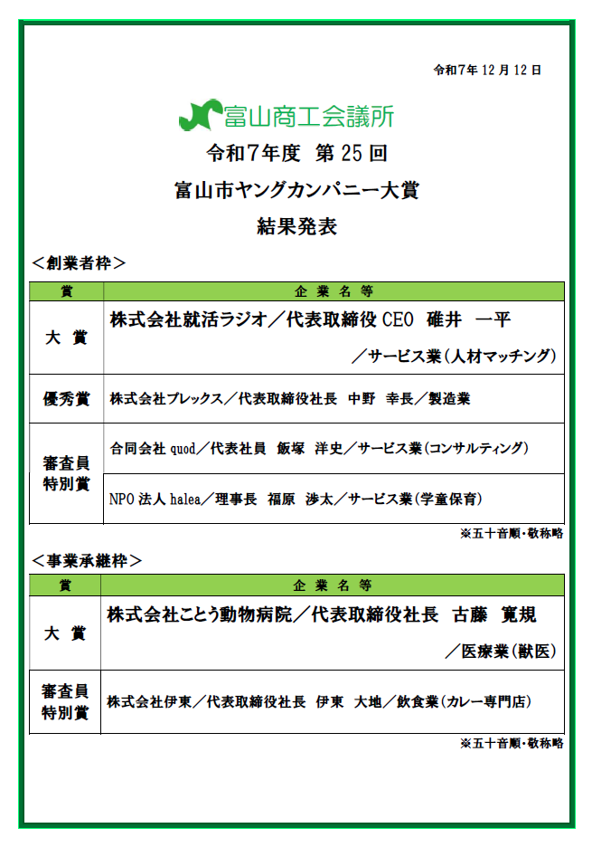 2025.12.12 令和7年度富山市ヤングカンパニー大賞/富山市グッドアクションカンパニー大賞 受賞結果 ≪速報≫ お知らせ 8月から募集を開始しておりました『富山市ヤングカンパニー大賞』と『富山市グッドアクションカンパニー大賞』。 本日(12/12)審査委員会・運営委員会を経て、受賞企業が決まりました。 受賞された企業の皆さま、おめでとうございます!!