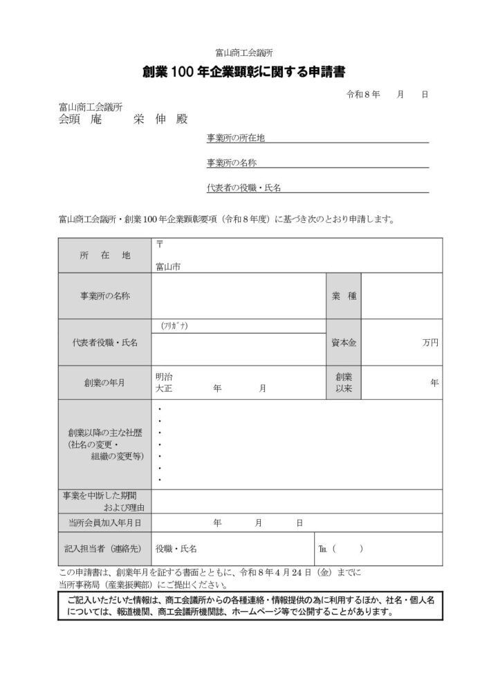 創業100年企業顕彰に関する申請書(PDF)をダウンロードし、内容をご記入の上、当所までお送りください。
