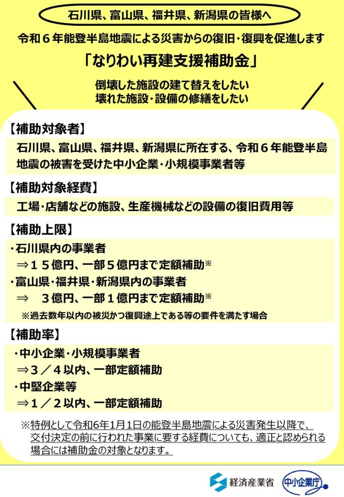 2024.02.07 「なりわい再建支援補助金」について お知らせ 「なりわい再建支援補助金」は施設等復旧に関連する補助金です。 詳しくはこちらをご覧ください 富山県なりわい再建支援補助金 富山県 被災事業者のための支援に係る電話相談窓口の開設について「被災事業者復旧等支援窓口」TEL 076-444-3962 PDF [367.66 KB]