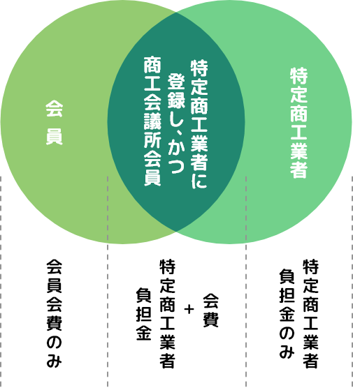 商工会議所会員は、企業規模に関係なく会議所の目的に賛同し、自己の意思により任意に加入された事業所ですが、特定商工業者は会議所の会員・非会員に関わらず、法律で定められています。