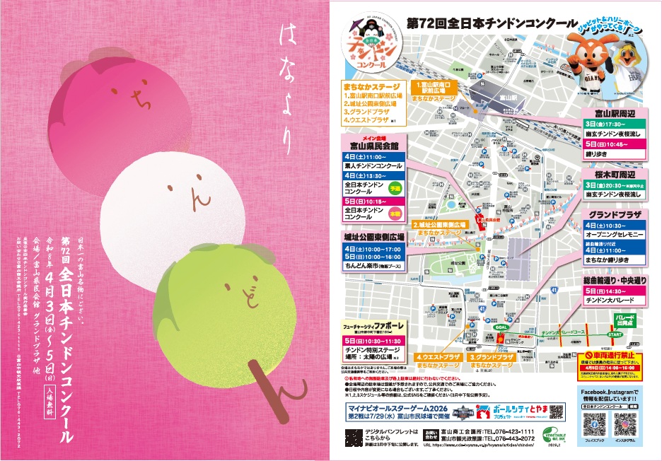 第72回 全日本チンドンコンクール令和8年4月3日(金)~5日(日) 開催!! ちらし オーディエンス審査員募集 ≪定員に達しましたので募集を終了いたしました≫ ボールシティとやまブース登場! YouTube『全日本チンドンコンクール富山』チャンネル Facebook Instagram English チンドンコンクールのお知らせ一覧