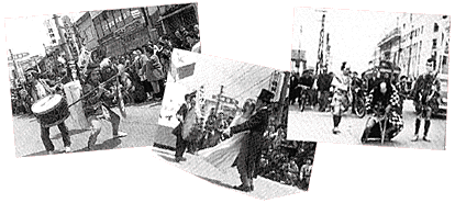 また、地元のサンバチームも誕生。自主製作の“光の街のサンバ”のリズムに乗って、若者から子供までが、陽気に踊りを繰り広げるようになった。 とにもかくにも、全国に鳴り響いた《チンドン・コンクール》。人と人とのふれあいの街角に、郷愁のメロディーと笑いのうず!その素朴さに限りない拍手をおくり、いつまでも“チンドン”の続くことをねがってやまない。 |