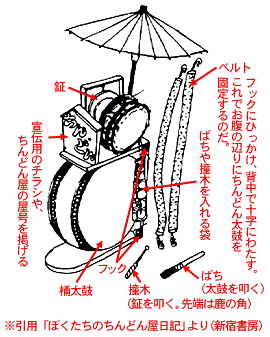 | 鉦(かね)と太鼓がつているから“ちんどん”。 |