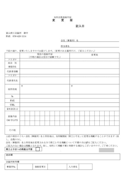 会社名、代表者名、住所など、変更がありましたら、下記の用紙にて当所までお知らせください。 ≪お問い合わせ先≫富山商工会議所 産業振興部TEL:076-423-1170(直)FAX:076-423-1114 こちらの変更届で会員退会に関するお申し出は受付できません。退会については手続きが異なりますので、お電話にてお問い合わせください。 ダウンロードはこちらから PDF [259 KB] Word [44 KB] もどる