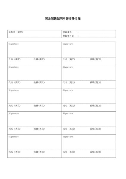 | 署名 | 1)登録できる署名は1名につき1つです。 2)必ず本人の肉筆であることが必要です。 3)原産地証明書はじめ認証を受ける書類及び典拠書類上の署名と同一であることが必要です。 |