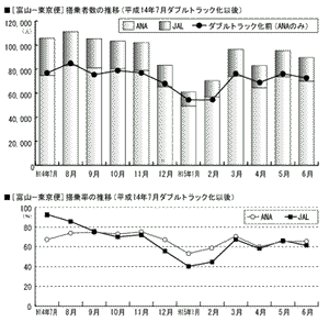 1年間で24万人もの利用者が増えましたが、航空会社別の内訳をみると、当初、利用者がJALに奪われると思われたANAが対前年比98・5%の微減でほとんど影響がなく、新規参入したJALの利用者数がそのまま上乗せされた結果になっています。
