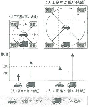 また、今後需要が増加すると思われる訪問介護サービスも、高齢者の人口密度が低い郊外ではカバーする範囲が広くなるため、1人のホームヘルパーの移動距離が長くなり、また燃料費(ガソリン代)もそれだけ多く掛かり、移動効率を低下させることにつながります。ごみ回収サービスの面でも同様です。(図1参照)