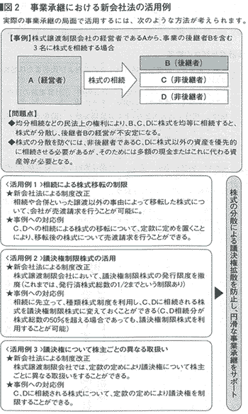 ■事業承継を円滑に行うには?近年、中小企業の後継者問題が話題になっていますが、相続や合併等により会社にとって好ましくない者に株式が分散することを防ぐにはどうしたらよいかが重要な課題となっています。 新会社法はこのような課題を解決する道を開きました。まず、(1)株式を譲渡制限株式とした場合でも、相続や合併等の事由による株式の移転は制限できませんでしたが、定款で定めることにより会社が相続等で移転した譲渡制限株式について売渡請求を行うことがでるようにしています。また(2)議決権制限株式を発行済株式総数の1/2までしか発行できませんでしたが、株式譲渡制限会社においては、この発行制限を撤廃しています。さらに(3)株式会社では原則として出資額に応じた議決権・配当を行うことになっていましたが、株式譲渡制限会社においては、株主総会の特殊決議により、議決権や配当について株主ごとに異なる取り扱いを定款に定めることができるようにしています。今後、これら(1)から(3)を上手に活用することによって、より円滑な事業承継が可能となり、会社の経営を安定させることができるようになります(活用例について図2を参照ください)。 ■会計参与の導入で決算書の信頼性が向上 これまで、中小企業における会計監査は主に監査役が担当していましたが、監査役には資格要件がないこともあり、名目的な監査役が設置されている会社が多くありました。このため計算書の信頼性の向上等を図るため,任意設置の機関として,会計に関する専門的識見を有する公認会計士(監査法人を含む。)又は税理士(税理士法人を含む。)が,取締役等と共同して計算書類を作成し,当該計算書類を会社とは別に保管・開示する職務等を担うという,会計参与制度が導入されます。 株式会社であれば、定款で会計参与を設置することを定めるだけでよいのです。また、会計参与の導入は会社の任意であり、義務付けられているものではありませんのでご注意ください。 ■会計参与の主な責任 会計参与制度の概要は表1のとおりですが、特に重要と思われる会計参与の責任については、次のとおり、会社や第三者に対して社外取締役と同様の責任を負います。また、会計参与の氏名または名称は登記事項となります。 (1)会社に対する責任 会計参与が会社に損害を与えた場合は、損害賠償等の責任が生じます。この責任は過失(不注意ミス)があった場合の責任で、株主代表訴訟の対象にもなります。 ただし、損害賠償額については、会計参与の善意(知らない状態で)重過失(重大な不注意ミス)がない場合、株主総会の特別決議により、報酬の2年分までに制限することが可能です。また、責任限定契約をしておくこともできます。 (2)第三者に対する責任 会計参与が、職務について悪意(知っている状態)または重過失があったときは、第三者に対して損害賠償責任が生じます。 表1 会計参与制度の概要