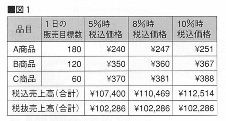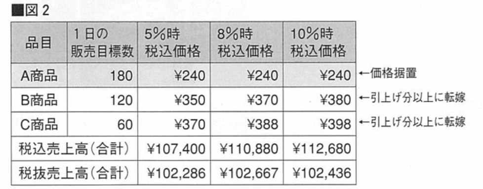 一律に価格転嫁した場合のシミュレーションが(図1)です。税抜の売上高は10%引上げ後でもほぼ同金額確保できていますが、税込価格は端数が出たり統一感がなく、場合によっては割高感を感じる顧客の離反が生じ、想定販売数を下回ることも考えられます。