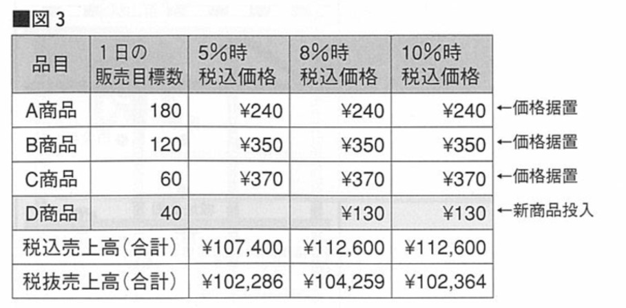 そこで例えばA商品が自社にとっての人気商品や定番商品=この事業者を選定する理由となる商品とした場合にその商品は価格据置にして、その分他の商品に税率引上げ分以上の価格を設定することにより事業全体で売上を維持することを検討します。(図2)このやり方に関しては前回の消費税率引上げ時に「事業全体で適正な転嫁をしている場合には、ある特定の商品・サービスで税率を上回る値上げを行っても、便乗値上げには該当しない」(経済企画庁物価局「消費税改正と物価」平成9年4月)という見解が政府より示されました。今後改めて見解が示されることもありますので留意してください。