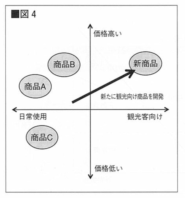 逆にその新商品の既存商品との違いや商品力が際立っていないと、単に既存商品との自社内競合が発生して、目標の売上を達成できない危険性もあります。商品別の売上推移や原価率、商品特性と主要顧客動向など、これまでの商品戦略を改めて確認してみる必要があります。ポジショニングマップ(図4)などを活用して自社に欠けている商品群を検討するのも有用です。