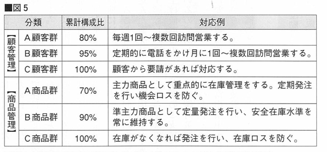 B to Bであれば顧客担当の営業力や交渉力のスキルアップが重要です。中小企業の限られた経営資源で効率的な営業を行うには売上シェアに応じた顧客管理が重要であり、例えば顧客のABC分析により営業対応を明確に区別します。(図5)