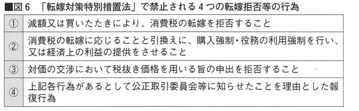 また特にB to Bの場合、交渉力を保持するためにも、平成25年10月1日より施行された「転嫁対策特別措置法」(図6参考)、そしてそれ以前から存在する「独占禁止法」「下請法」によって商品・製品を納入する事業者が法律等で守られていることを押えておくことも重要です。