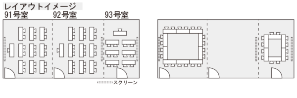 91、92、93号室はスライディングウォールでしきられておりますので、隣接する2室または3室をひとつの部屋としてご利用いただけます。
