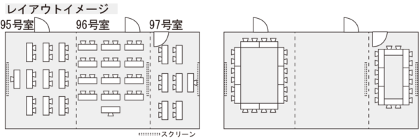95、96、97号室はスライディングウォールでしきられておりますので、隣接する2室または3室をひとつの部屋としてご利用いただけます。